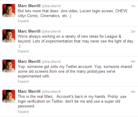 Marc Merrill(Riot公司总裁,也就是蛮王泰达米尔的原型)推特被黑,并公布了大量有关卡牌游戏的截图。