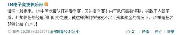 而后来,就是大家知道的桥段了,皇族公会的老板出资收购LM战队,并改名为LMQ.Tc,LMQ战队顶替LM进入LPL夏季赛。