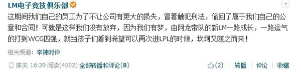 这件事,也被原LM官方微博自己证实,确实在当时LM战队自身存在拖欠工资的情况。而下一条微博更是令人啼笑皆非,这到底是像微博中提到的为了梦想的努力还是知法犯法的无知呢?