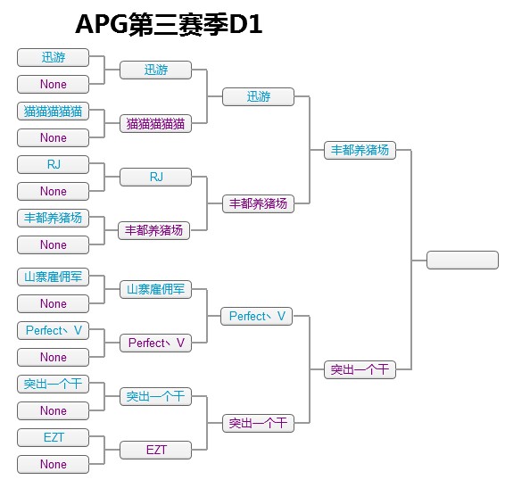 11月8日,APG英雄联盟超级联赛第三赛季进行了D组的比赛,D1的比赛中,丰都养猪场连胜RJ和迅游杀进D1决赛,下半区的突出一个干也以压倒性优势击败了EZT和Perfect丶V与丰都养猪场会师D1决赛。