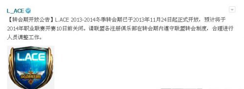 近期,L.ACE联盟发出了英雄联盟俱乐部转会期到来的消息。如图: