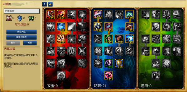 上单半肉AP天赋加点:如戴安娜、兰博等英雄。则需要选择,9.21.0的天赋,如坦克型上单天赋差不多,不同的是填出攻击系右边的法术9点。如图所示: