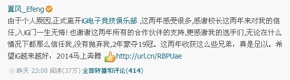 由于个人原因,正式离开iG电子竞技俱乐部,这两年感受很多,感谢校长这两年来对我的信任,入iG门一生无悔! 也谢谢这两年所有的合作伙伴的支持,更感谢我的选手们,无论在什么情况下都那么信任我,没有抛弃我,2年豪夺19冠。这两年收获这么些兄弟,真是足以。希望iG越来越好,2014马上奔腾。