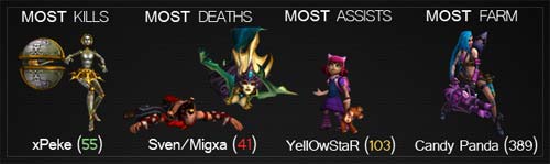 本周,在和兼顾实力与人气的LOL 老牌欧洲强队SK Gaming的比赛中,Svenskeren终于高高举起死亡圣杯! 他和SUPA HOT CREW的 migxa都在过去四周内死了41次!虽然他们各自的战队最近的收获都不错。同时, Candy Panda 把Rekkles踢出高分榜,使用新英雄疯狂萝莉-金克斯重新夺得打野最强手,并保持平均每局杀死389个野怪的记录。