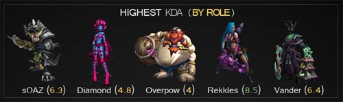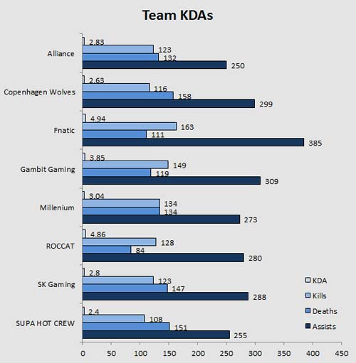 Fnatic仍以 4.94的KDA问鼎联赛最强队,但是, ROCCAT以4.86 的高分紧追其后。 虽然fnatic本周 死亡率上升了,他们仍然以385助攻和 163杀领先。