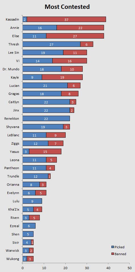 虚空行者-卡萨丁 终于率先在安妮和爱丽丝成为竞争最激烈的,因为安妮和爱丽丝本周内分别有游戏没有被挑选或禁止。 卢西恩 本周的人气超过 金克斯 ,荒漠屠夫—雷克顿 终于打败了Shyvana。Kayle 则超越了Ziggs和Gragas –虽然中单选手很少被列入禁用名单。