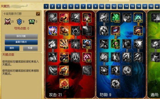 天赋21-9-0,因为EVE前期打野比较伤,我比较习惯玩AP,攻击天赋21点,点出固定攻击和固定法强,法术加成百分比不点。