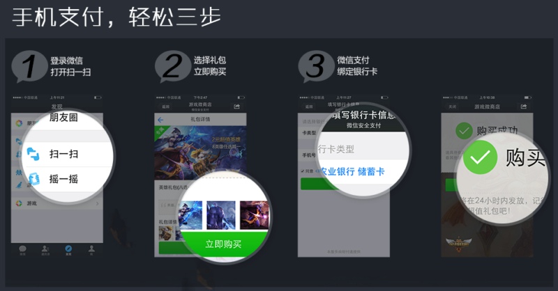 A:方法1:用微信扫描页面上方的二维码,立刻进入游戏微商店。方法2:点击微信“我→我的银行卡→游戏微商店→英雄联盟”,立即进入游戏微商城。请注意,使用方法2之前必须先进入一次游戏微商城,所以我们推荐召唤师们直接扫描页面上的二维码,进入游戏微商城。