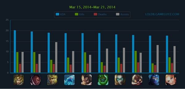 KDA高的英雄还是由EZ持续冠军,第三名的嘉文助攻率超级高,因为插旗只要队友吃到灵气击杀就可以有助攻啦!