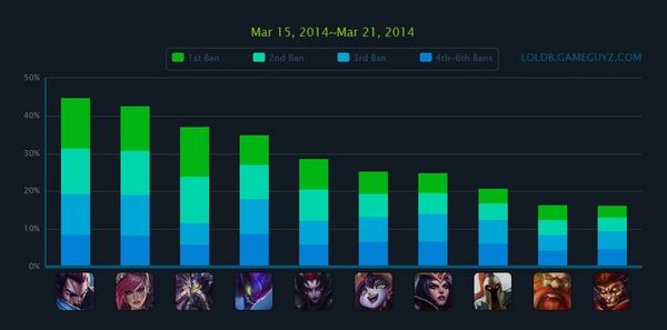 高BAN率本周由亚索夺得第一了,亚索现在玩法渐趋成熟,很多技术不错的玩家都可以用亚索打出漂亮的成绩,也难怪会被BAN了。