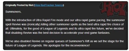 同时我们也决定在召唤师峡谷的常规匹配游戏里移除"重生"这个技能,为了更美好的未来。任何带来的不便我们深感抱歉。