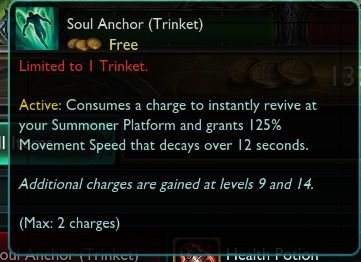 主动效果:消耗充能效果并且立刻在召唤师平台重生,获得额外125%移动速度加成,会在12秒内回复到本来速度。在等级9和等级14的时候可以提升充能数,最多2次充能。