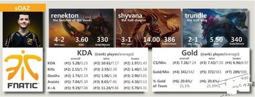 的成绩,认真看,我有时间。你发现KDA成绩的问题了吗?没劲前三?肯定不是。他的经济收入偏低,各项数据显示sOAZ主要是在发展团战和其他潜力,并没有专注于带线推和打金。战队有xPeke和Rekkles还需要金币么?只需要保护他们不被对手击杀,让他们有机会输出伤害即可。