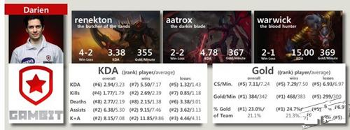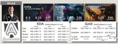 Wickd 和Darien 两个人数据很相似。Darien主张前期击杀对手的战术,击杀+助攻成绩排第二(平均每场成绩是8.15)。而Wickd