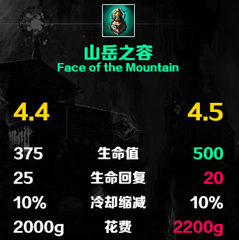 在4.5版本中,山岳之容的性价比遭到比较大的的降低,它的售价提升了200g,但它的生命回复效果去降低了5点,不过它提供的生命值却获得了大幅度的加成,现在为500生命值。
