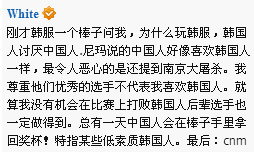 这条微博,很明显,投其所好。White现在的形象比较低迷,需要发几篇微博来挽回形象的。可是在韩服打个排位,搞的他好像在和韩国人打仗,需要上升到国家对立的程度吗。