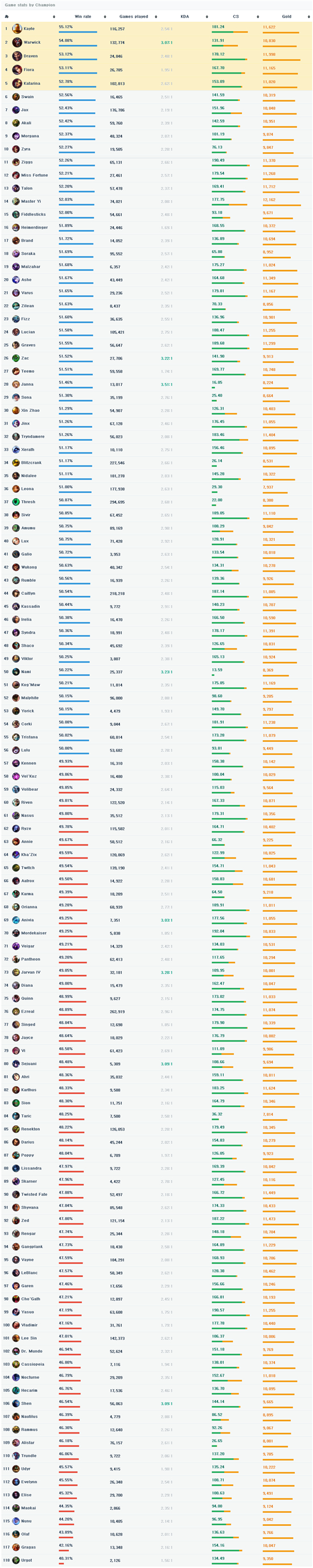 这次的新一周韩服胜率是从4月21日——4月27日,天使姐妹依然强力,胜率前列的几位依然影响不大; 火炬补丁之后狼人依然无解,剑圣的胜率下去了,武器赵信相对安定; 4.6补丁之后,Kass胜率回升到50%以上,狮子狗略有提升,酒桶是死透,剑魔胜率下滑,兰博胜率不错。
