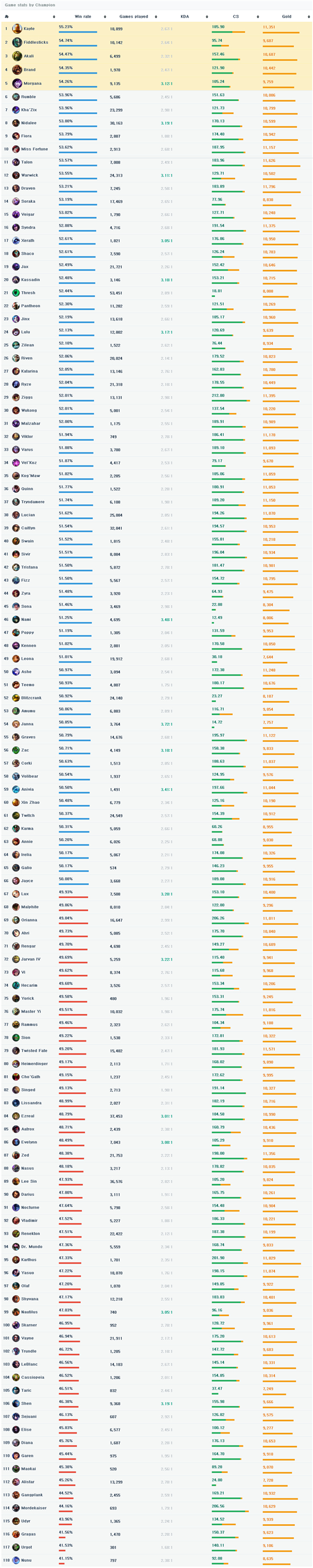 这次的新一周韩服胜率是从4月21日——4月27日,天使姐妹依然强力,胜率前列的几位依然影响不大; 火炬补丁之后狼人依然无解,剑圣的胜率下去了,武器赵信相对安定; 4.6补丁之后,Kass胜率回升到50%以上,狮子狗略有提升,酒桶是死透,剑魔胜率下滑,兰博胜率不错。