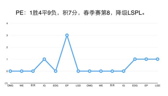 去年夏季赛的王者,但本身夏季赛能夺冠对于季后赛前主力打野离队的PE而言,就已经是个不小的奇迹了,到了这个赛季,队内最主要的Carry点下路二人组分别转型教练和转会,使得这支卫冕冠军再无昔日风采。补充到队里的新人Face、Ycc、Lovec,从OMG补充过来的达七,再加上老队员JOJO、阿鲁卡,六个人在新赛季努力的支撑着这支队伍。但可惜,大量的人员更换、位置调整使得这支战队在联赛前中期战绩非常不好;经过多次人员和位置调整,在首发人选和位置都稳定且经过了多场比赛的历练后,PE也找到了胜利的感觉,逼平EDG估计算是本赛季最大的冷门了;但这时候已经是联赛末尾了。由于联赛前中期的持续低迷,PE不得不以卫冕冠军的身份降级到LSPL;如果PE在联赛末期的这种状态能在初期就找到的话,说不定保级也不是梦。