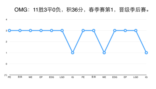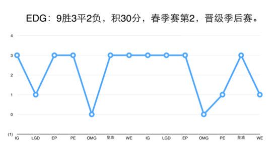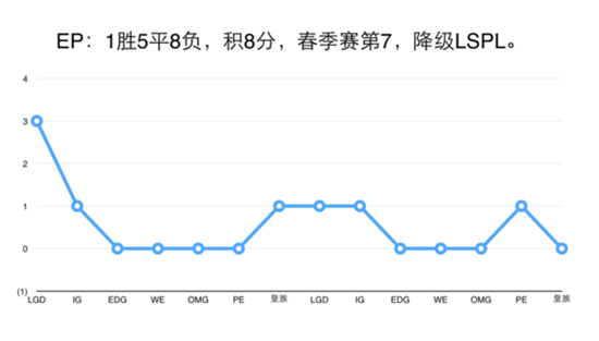 EP在去年夏季赛加入LPL,当了一个赛季的经验宝宝,被淘汰后又顽强的打回了LPL。这个赛季初,EP的状态一度让大家对这个战队另眼相看;可惜,纵观整个赛季,正如图中体现出来的,EP的状态是一路下滑的。第一天直接2:0战胜LGD,使得夏季赛艰难取得首胜的香港同胞们精神上得到了极大的鼓舞;但可惜,这也是他们这个赛季仅有的一场胜利。在之后,他们也有过两度战平IG的战绩;可惜,他们在对阵PE的两轮关键比赛里只取得了1分,又在面对OMG、EDG、WE的时候毫无招架之力。连续的败北直接影响了EP这支战队的状态,最终他们在最后一场保级关键战中败给了皇族,降级到LSPL。