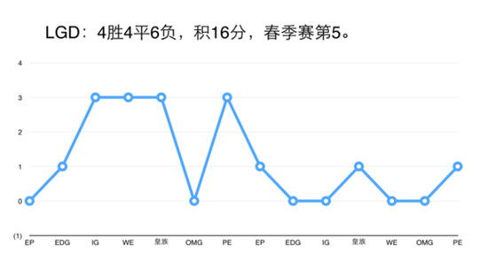 LGD是很老牌的战队了,在经历过大换血后终于成功杀入LPL,除了老队员平野绫,quan、骑士、Styz、镜花水月都算是新人。进入LPL前,LGD素有"前十分钟世界强队"的称号;而通过折线图我们也可以看出,如果把整个春季赛看成20分钟就结束的比赛,那LGD也是应了他们的这个称号了。可以说,LGD整个赛季的表现就是虎头蛇尾的完美体现,第一轮和第二轮的表现简直判若两队。