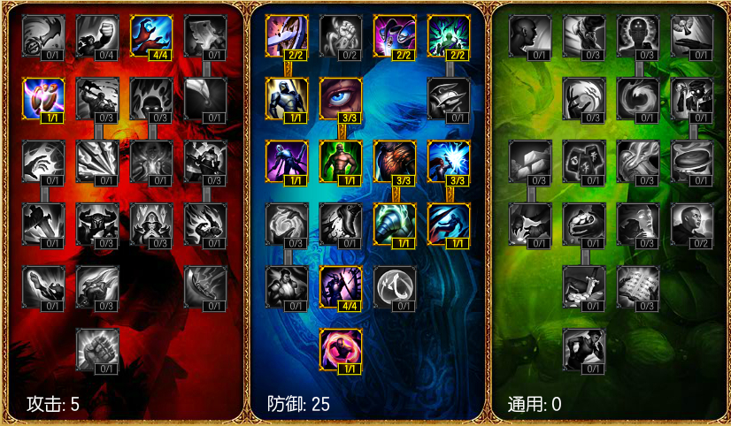 5-25-0的坦克打野的天赋,S4版本的防御系天赋比攻击系天赋强很多,非常值得投入25点,因为扎克的被动可以一直回血,所以防御系所有回血的天赋都可以不点,因为那点回血和被动比起来不值一提。点出护甲和魔抗提升前期的抗性。而攻击系点出5%的冷却缩减非常的有用,天赋5%+符文5%+蓝buff10%+振奋铠甲10%+蛋拳10%正好40%的冷却缩减。会让扎克的技能cd非常非常的短,可以一直粘着对面C位打。点出洞悉弱点不管是团战还是前期gank都能帮助队友的伤害高一些。