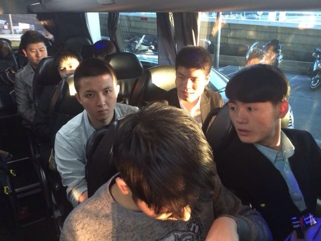 队员们在机场大巴上