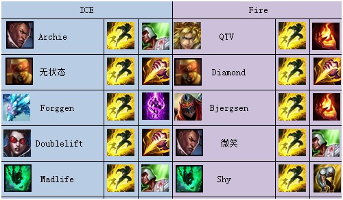 本场表演赛双方选择正常对线,但FIRE队主动对队伍做出调整,让前几日比赛中的辅助QTV和上单SHY互换位置.前期FIRE队的下路并没有受位置调整影响并占据一定优势.中路冰霜之子Forggen的冰鸟在线上居然并没有被劫压制.顶替草莓出场客串打野的无状态本场比赛发挥出色,原本是中单选手的无状态,在比赛中将FIRE队打野diamond全面压制,中期与Madlife的锤石配合,各路作案,拉开了双方经济差距.当队友帮助FORRGEN度过发育期后,冰霜之子的冰鸟接管比赛.最终双方因装备差距过大,在ICE队越高地塔击溃FIRE队后,拿下比赛胜利.