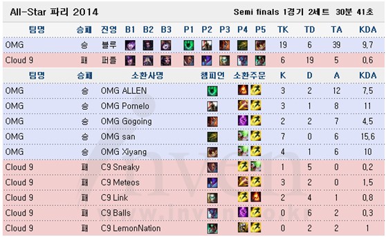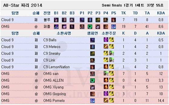 第一场比赛双方下路全部换上.但C9一级团干扰了OMG的上线节奏,导致OMG在龙女和璐璐两点上前期处于劣势.C9抓住这两点前期的劣势,在比赛初期占据了主动.C9本场依旧针对OMG上路,OMG在中期稳住了局势,在19分钟小龙出团战,药导锤石2次关键的Q技能拉中贾克斯和豹女,OMG赢得这波团战,将前期的劣势扳回.随后双方进入僵持,场上竞争进入白热化,25分钟强打掉第一条大龙,随后OMG进入习惯的节奏,推掉C9所有外塔,压缩C9的活动空间.药导的锤石再次立功,再次Q中C9关键英雄,打出一波1换4后拿下大龙,此时比赛大局一定。随后OMG在打出一波1换4团战后,攻上高地,拿下第一场比赛胜利.