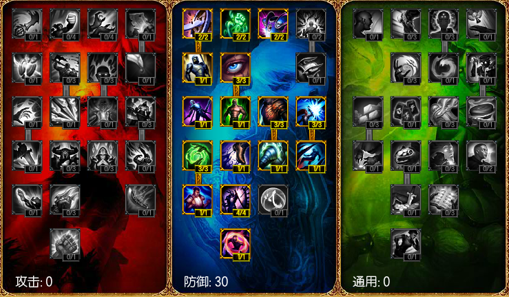 解析:0-30-0全防御天赋,最适合梦多的天赋,梦多的攻击天赋并不出色,但其是天生的防御者,将30点天赋全点在防御上,能最大限度地增加梦多的防御能力,由于梦多的技能消耗血量,因此点出回血天赋十分必要,30点的天赋点,足够将梦多所需要的所有防御天赋都点出来。