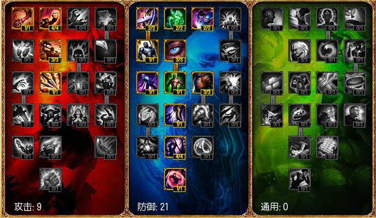 狗头还是主防御为主,攻击天赋中点出基础的增加攻击力,点出双刃剑,增加近战的输出。防御中主要增加抗性,生命值,并减少伤害,也是比较常见的一个点法。因为狗头容易被风筝,所以点出减少控制,减少减速效果,这几个天赋也是非常实用。