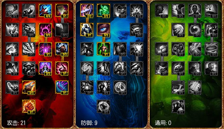 解析:21-9-0,塞恩由于是个近战法师,前期对线难免会被对手频繁地使用平A骚扰,9点天赋点在防御页上,能很好地降低对手的平A的骚扰。21点攻击天赋中,盛宴天赋与危险游戏天赋十分适合非常缺蓝的塞恩,前期配合多兰戒,塞恩只要不乱放技能,线上的续航能力能有很好的提升。