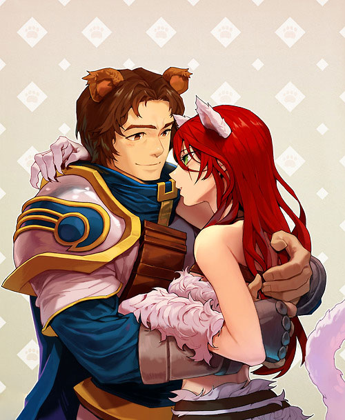 也许是早期对于背景故事翻译的失误让两人有了一段"婚约",这个美丽的失误再玩家心中深深扎下了根,虽然事后有许多玩家澄清两人其实并没有婚约,但这一点都不影响盖伦和卡特在玩家心目中的地位。更何况在官方背景故事"正义周刊"中盖伦对卡特英雄救美的身姿也着实耍了一把"帅"。