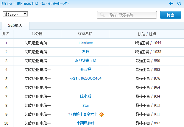 第一步:搜索一区艾欧尼亚最强王者的前20名: