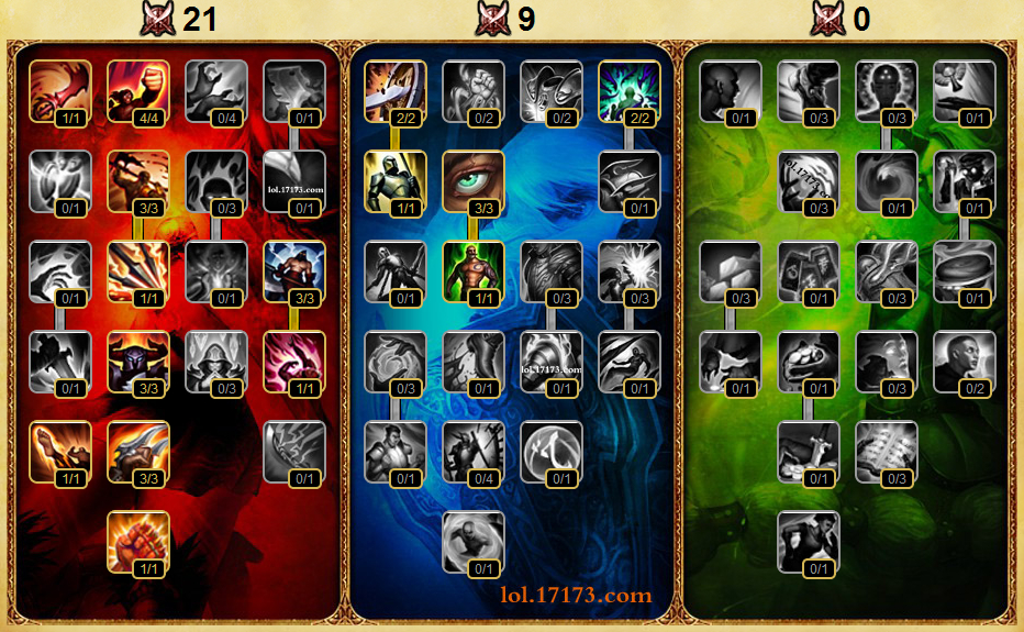 21-9-0的标准普工型AD打野天赋。虽然adc不点出双刃剑,但是打野老鼠点出来更好一些,不管是前期gank还是后期伤害都能打足一点,而且老鼠开大招后射程非常远,对方前排很难切到你。而老鼠是纯平a打伤害的英雄,冷却缩减没什么大用处,所以就点出攻速,然后一竖行一直点下去。而危险游戏这个小编非常推荐点出来,每杀一个人就能恢复5%的血和蓝,1000血的时候就能回复50血。不管是前中还是后期都很好用。有时杀掉对方后血量很低而且身上有点燃,这时候这个天赋就可以救你一命。点出狂暴只要暴击就提供5%的攻速,很好用。防御天赋点出硬化皮肤可以抵挡小怪的伤害(因为无伤打野大怪不打你),彻彻底底做到无伤打野。