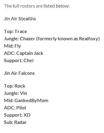 而Jin Air Falcons队大换血 就留下了中单GankedByMom以及S队的辅助XD