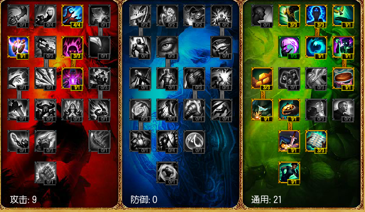 标准的0-9-21,主通用副防御的天赋,万金油天赋,适用性强。