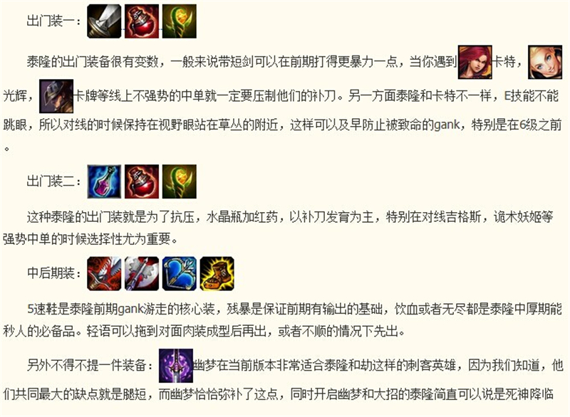 打团的时候泰隆最好不要先手,因为你只有一套技能,很可能进去了就出不来,另外在目标的选择上,最好优先秒杀敌人的ADC或者APC,在这一点上他和卡特这种收割残血来刷新技能的英雄有着天壤之别。