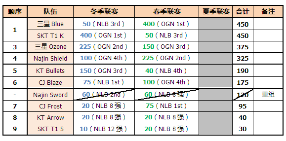 OGN春季赛落下帷幕,各队循环总积分整理如下。