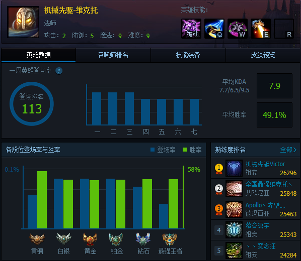 机械先驱,一个对技能把握需求比较大的英雄,他的E在开启了只能施法后同兰博的R一样,需要拖动一下才可以扔出去,而他的主要输出就是靠这个技能。不过,E的命中率,W的不稳定控制,Q的飞行速度过慢导致护盾距离技能施法大概有1s左右的延迟,以及R需要7s才能打出全部输出,都是维克多的硬伤。相对于发条,爆破,辛德拉来说,还是有所欠缺的,加上操作手感方面确实是不怎么友善。这也是导致他不受欢迎的原因吧。