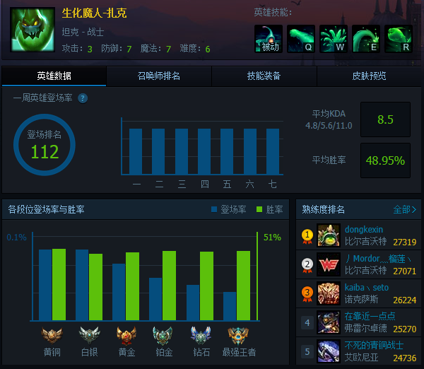 扎克,个人感觉从它刚被做出来就没有特别火过,中规中矩的减速,需要时间才能进行的位移,距离较短的输出技能,以及诡异只能单次击飞的大招。相对于鳄鱼龙女之类的上单并没有特别出色的特点,相对于卡兹克,盲僧之类的打野也并不能发挥出优势,论全面性略逊于蜘蛛和蔚。于是乎,登场率如此之低也是理所之中的。