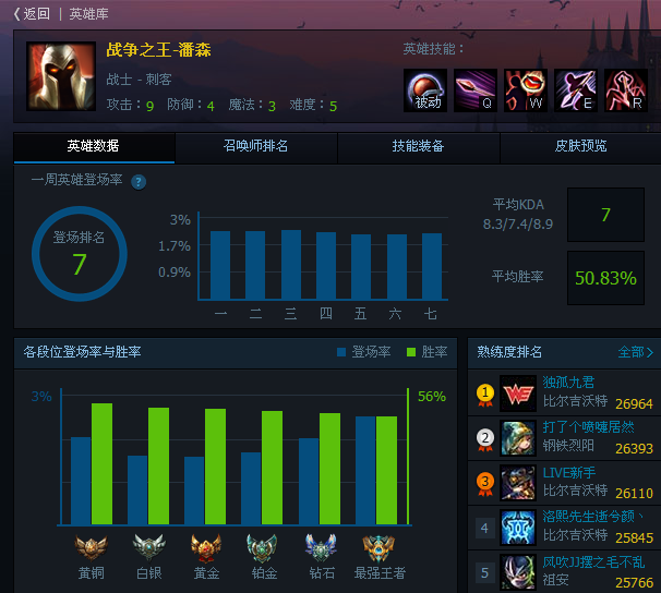小编对潘森的准确定位是前期carry队友,后期团战大招切入的半肉战士型刺客。玩好当前版本的强势打野潘森,一定离不开这两点。另外潘森打野适应性很广,任何需要半肉刺客的队伍,潘森打野都可以胜任。