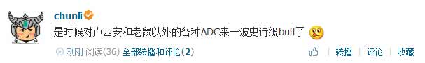 但设计师chunli在微博透露,将为除卢锡安和老鼠外的ADC添加史诗buff。
