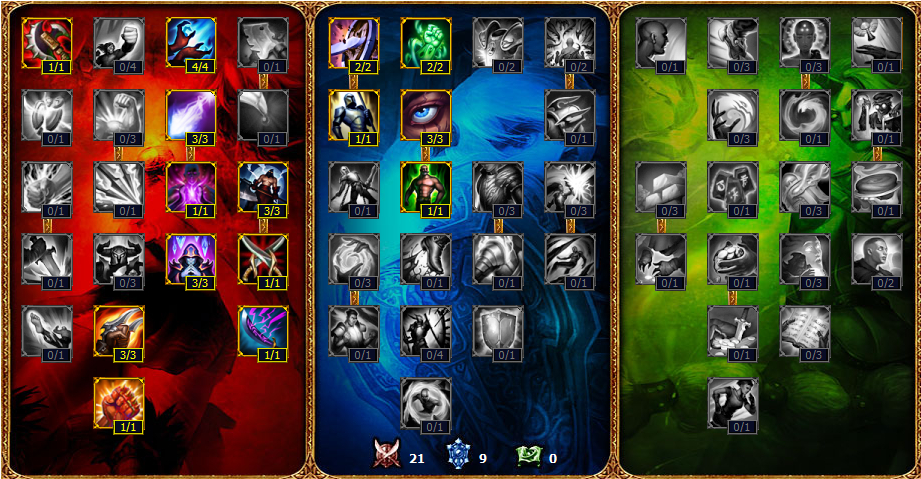 30-0-0拼命天赋,用这个天赋前提是对面前期消耗不到你多少血,而且你对自己的操作很有信心的时候用这个天赋,推荐一个可以用这个天赋的对线英雄:豹女。因为豹女前期比小鱼人还弱,所以30-0-0就是干,除了上面的21点外点出攻击系的两个,战争领主不要点,因为小鱼人也不出AD装备,这三点浪费。点出洞悉弱点加强队友伤害,还有两个编织,让小鱼人在没有耀光前,技能+平a的伤害也高一些。除了耀光后伤害更是暴高。
