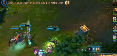 比赛开始3分钟,KTA四人在Jin Air下塔面前完美顶塔,击杀三人。