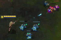 如果现在没任何压力,想要补刀是很容易的。但当跟你对线的敌人也想要在线上补刀时,那么换伤害和骚扰就不可避免了。换伤害的前提是你对敌人造成的伤害比敌人对你造成的伤害多。在线上,跟敌方ADC和辅助换伤害是压制敌人建立线上优势的方式之一。强迫敌人在补刀的时候吃伤害也是主要的骚扰手段。
