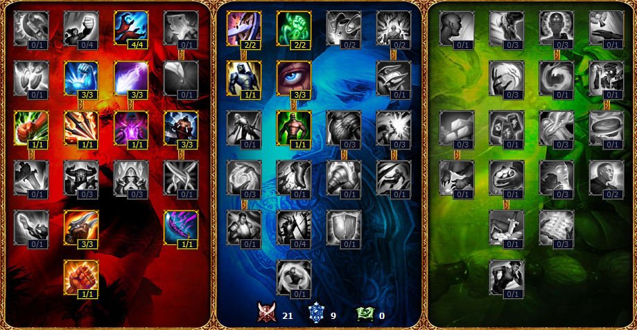 对线AD的21-9-0天赋,因为一般上单AD都具有突进技能,所以点出防御天赋的9点增加血量和防御能力。攻击系学问有点大,第一排点出减CD配合符文出门就有10%的减CD,然后点出加攻击力和法强的四个天赋,虽然装备是纯AP,但是前期天赋双休伤害更高一些,然后点出死神增加伤害,点出法术编织可以让AQ伤害更高,因为Q技能后期CD非常短。然后点出奥术之刃增加平a伤害。最后点出双穿和末日浩劫。
