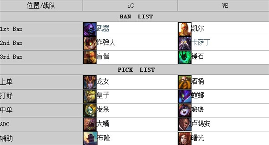 下面是由 WE 对阵 iG 的比赛战报,以下是双方BP情况: