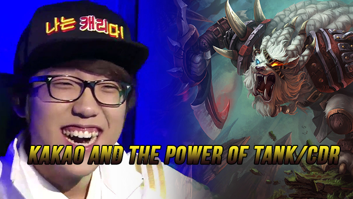 在KT A与JIN AIR Stealths的比赛中,雷恩加尔就在另外一个非常不同的情况下登场了。中上路有了贾克斯的璐璐,KT A已经有了足够的爆发能力,但是却难以在野区和塔下抓死对手。最为重要的是,KT A的阵容中并没有坦克(注:虽然三星Blue的Spirit出了烈焰之炬他们也没有坦克,但是有凯尔的大招,解决了爆发阵容缺乏坦克的问题)。