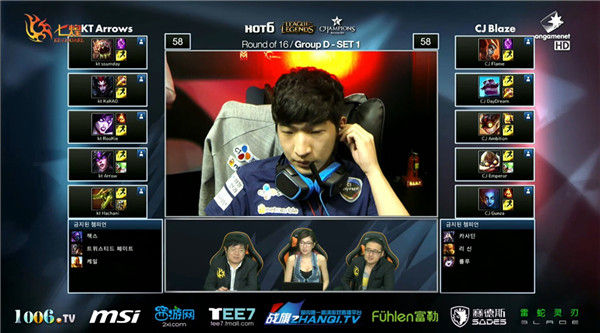 第二局就比较尴尬了,CJBlaze打的并不好,第一盘5分钟上路就打了起来,寡妇没能抓死莫甘娜,被赶来支援的Kakao反杀3人,KTArrows人头4:1领先。而后期更不好打,Flame老是被针对,人头数再一度拉开,KTArrows成功收下本局!第二局CJBlaze打的依旧中庸,开头越塔杀对方蒙多拿下一血,后团战完全不给力,再以0:2惨败给了对方。